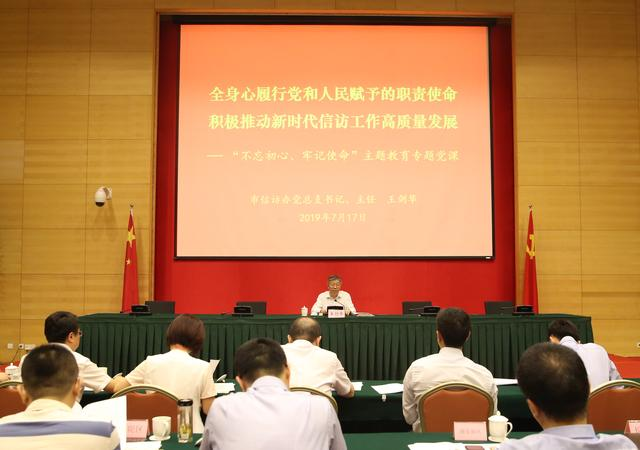 王剑华指出,信访部门是党的政治机关,信访工作的初心和使命同党的初心使命相统一,是党的初心使命在人民信访工作中的生动实践。要旗帜鲜明讲政治,站稳信访工作的政治立场,坚持以人民为中心的政治标尺,增强防范化解风险的政治能力,将“不忘初心、牢记使命”作为新时代信访干部的价值取向、实践遵循。要以坚定的理想信念为根基,以过硬的理论武装为保证,以强烈的宗旨意识为动力,以自觉的自我革命为担当,将“不忘初心、牢记使命”作为每名党员干部的精神旗帜、终身课题。